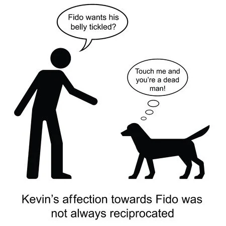 Does he? Let’s put this into some perspective. If these were young children coming in past the principal of their school, the first child would be an older kid who made eye contact and moved on. The second kid would be a first grader who said “HI! I have a new baseball” and ran off to join his class. The third kid would be a fourth grader who charged at me screaming and tried to climb me. Describing behaviour in terms of how a child might behave often helps us to determine what is normal and what is not when it comes to a dog’s behaviour. I want to be clear-dogs don’t behave like humans, but we can draw parallels in social situations to help learn more about what they are doing. In this case, there is a strong disconnect between the dog’s behaviour and the person’s interpretation of that behaviour.