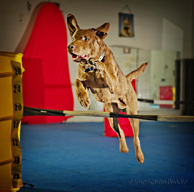 This is a very complex behaviour that is built on strong foundational skills. In order to get this picture, D’fer had to be able to sit and stay, to follow my cue to jump the correct jump and to look in mid air for the next cue. If the foundation is not solid then the end goal behaviours will not be solid either. Photo Credit: Karen Brody